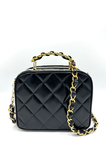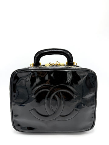 100% Authentic Chanel Black Patent Quited Top Handle Vanity Condition: 9/10 Dimensions: 8.25"W 6.75"H 3.75"D...