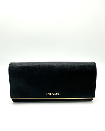 100% Authentic Prada Black Saffiano Gold Bar Flap Long Wallet Condition: 9/10 Dimensions: 7.25"W 3.5"H...