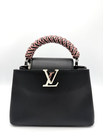 100% Authentic Louis Vuitton Black Weaved Chain Capucines BB Condition: 9/10 Dimensions: 10.5"W 7"H 3.5"D...