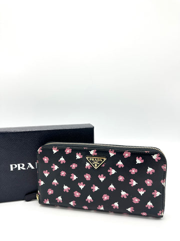 100% Authentic Prada Black Saffiano Pink Floral GHW Zippy Wallet Condition: 9/10 Dimensions: 7.5"W 4"H...