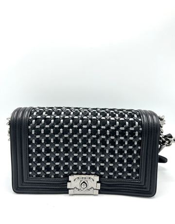 100% Authentic Chanel Black Weaved Patent/Suede Leather Medium Boy Bag Condition: 9/10 Dimensions: 9.75"W 6"H...