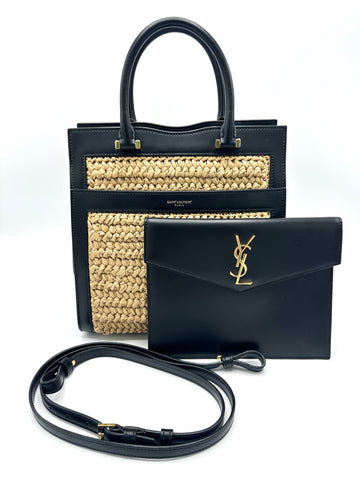 100% Authentic Saint Laurent Black/Raffia Uptown Tote w/ Clutch Condition: 9.5/10 Dimensions: 9"W 9.25"H 4.5"D...