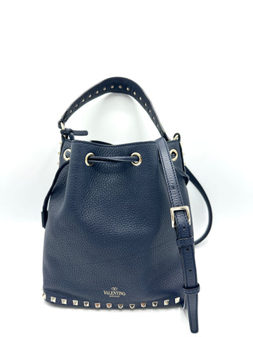 100% Authentic Valentino Blue Pebbled Leather Rockstud Bucket Crossbody Condition: 9/10 Dimensions: 8.5"W 9.25"H 5.25"D...