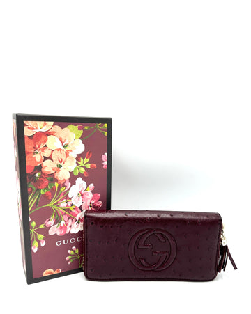 100% Authentic Gucci Bordeaux GG Soho Ostritch Leather Wallet Condition: 9.5/10 Dimensions: 7.5"W 4"H 1"D...