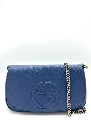 100% Authentic Gucci Blue Pebbled Leather GG Soho Chain Crossbody Condition: 9/10 Dimensions: 10.5"W 6.5"H...