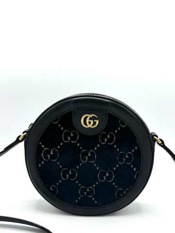 100% Authentic Gucci Blue Velour GG Circle Crossbody Condition: 9/10 Dimensions: 7.5" Diameter "W 2"H...