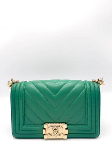 100% Authentic Chanel CC Green Chevron Small Boy Bag Condition: 9/10 Dimensions: 8"W 5.5"H 2.5"D...