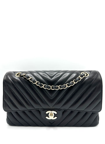 100% Authentic Chanel CC Black Chevron Lambskin GHW Medium Double Flap Condition: 9/10 Dimensions: 10"W...