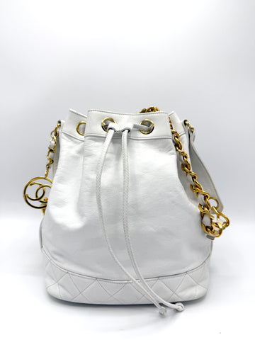 100% Authentic Chanel 24k White Lambskin CC Medallion Chunky Chain Bucket Bag Condition: 9/10 Dimensions:...