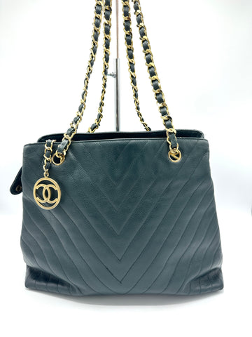100% Authentic Chanel 24K Pine Green Caviar Chevron CC Chain Tote Condition: 8.5/10 Dimensions: 12.5"W...