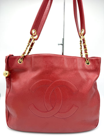 100% Authentic Chanel 24k Rare Red Caviar XL Chain Tote Condition: 8.5/10 Dimensions: 15.5"W 13"H...