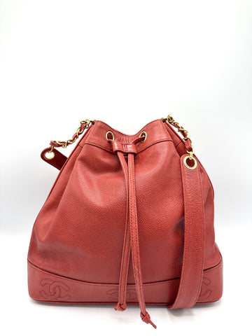 100% Authentic Chanel 24k Red Caviar Triple CC Bucket Crossbody Condition: 8.5/10 Dimensions: 12"W 4"H...