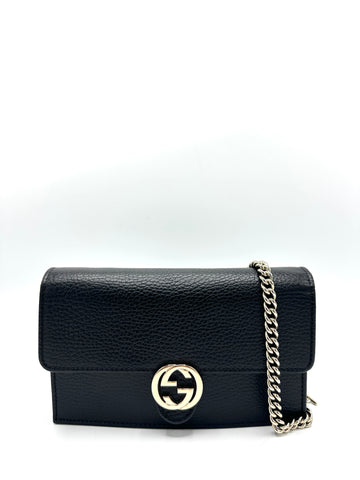 100% Authentic Gucci Black Interlocking GG Pebbled Leather Chain Flap Condition: 9.5/10 Dimensions: 7.5"W 4.5"H...