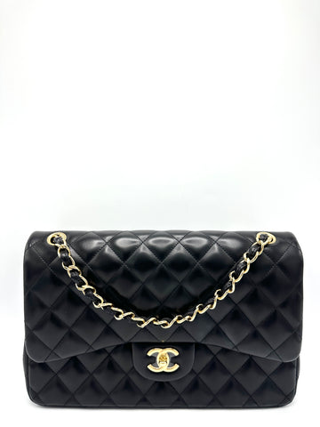 100% Authentic Chanel Black Lambskin GHW Jumbo Lambskin Double Flap Condition: 9.5/10 Dimensions: 12"W 8"H...
