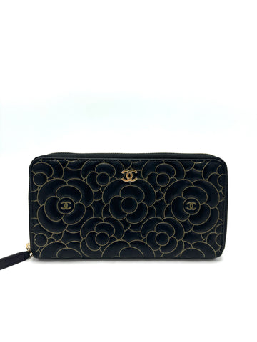 100% Authentic Chanel Black Lambskin Gold Border Camelia Flower Zippy Wallet Condition: 9/10 Dimensions: 7.5"W...