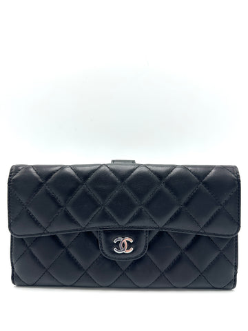 100% Authentic Chanel Black Lambskin SHW Double Snap Flap Long Wallet Condition: 9/10 Dimensions: 7.5"W...