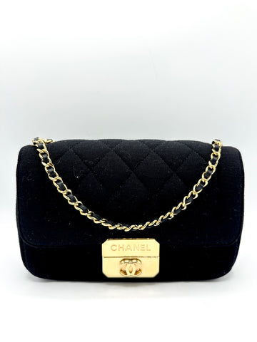 100% Authentic Chanel Black Jersey GHW Clasp Mini Rectangular Flap Condition: 9/10 Dimensions: 7.5"W 5.5"H...