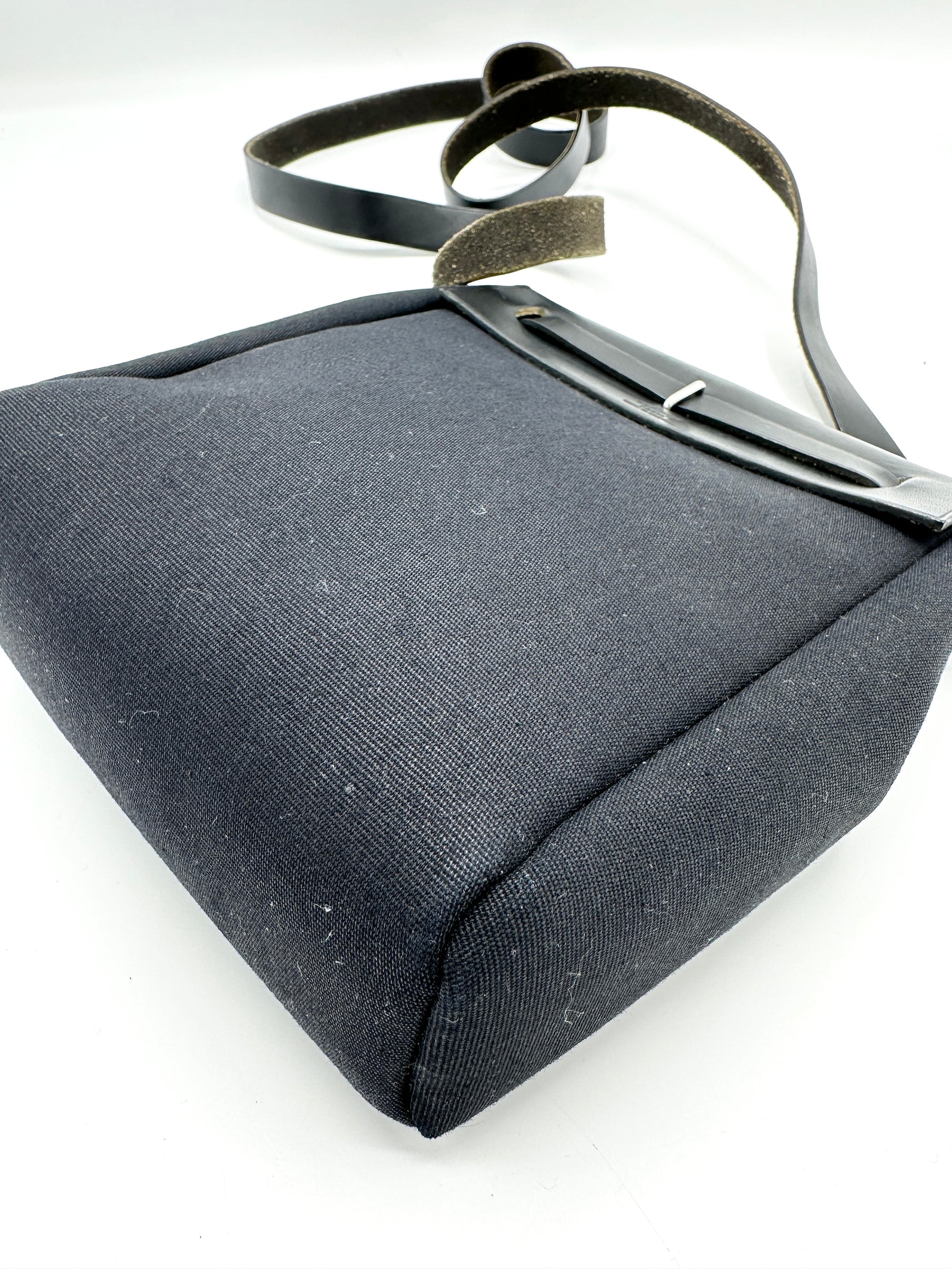 Details: Minor dust marks on exterior canvas, few scratches on exterior leather, minor wrinkling and few scratches on leather strap, minor fading on corners, minor rubbing on interior suede, few dirt specks on interior canvas