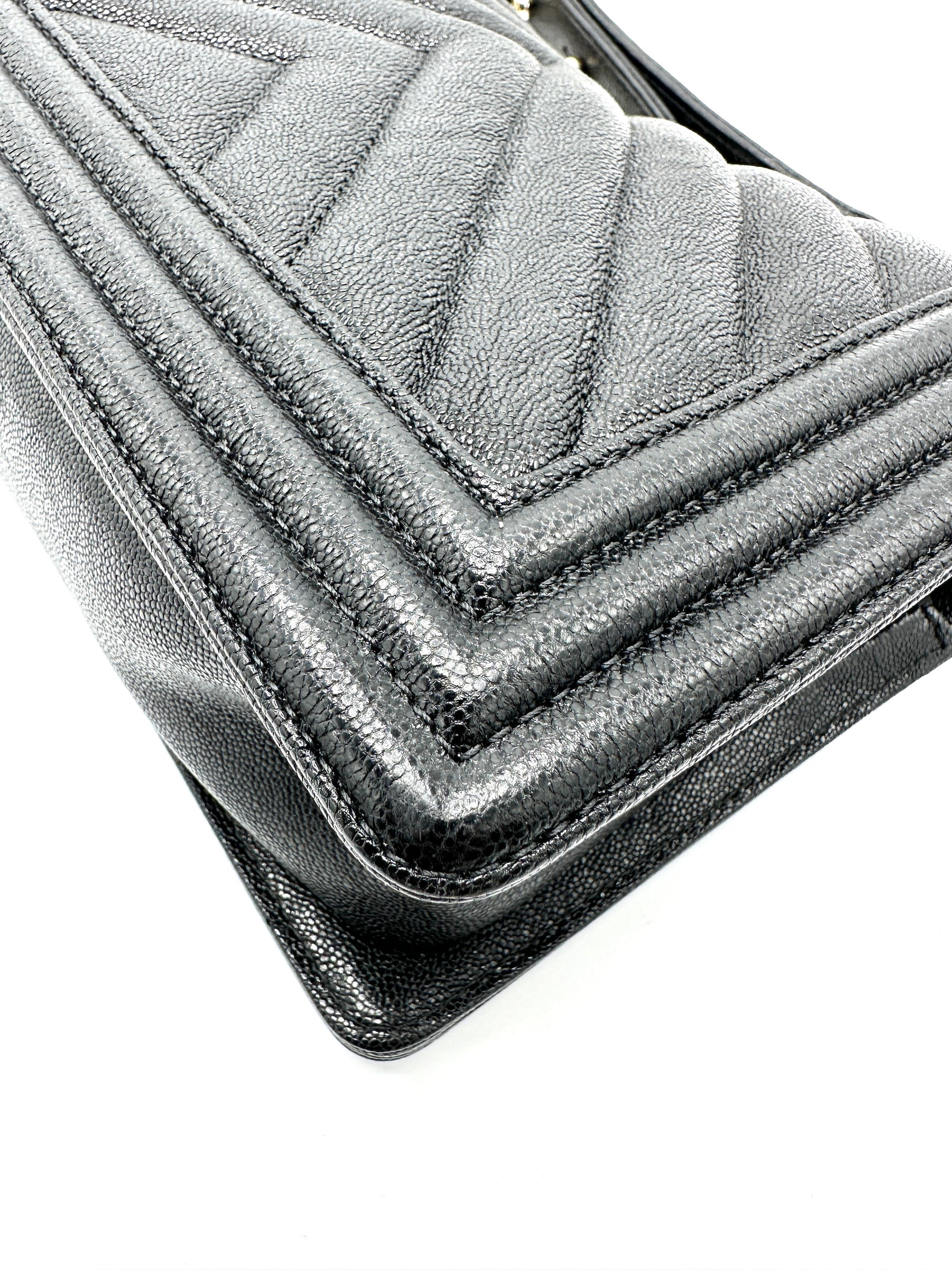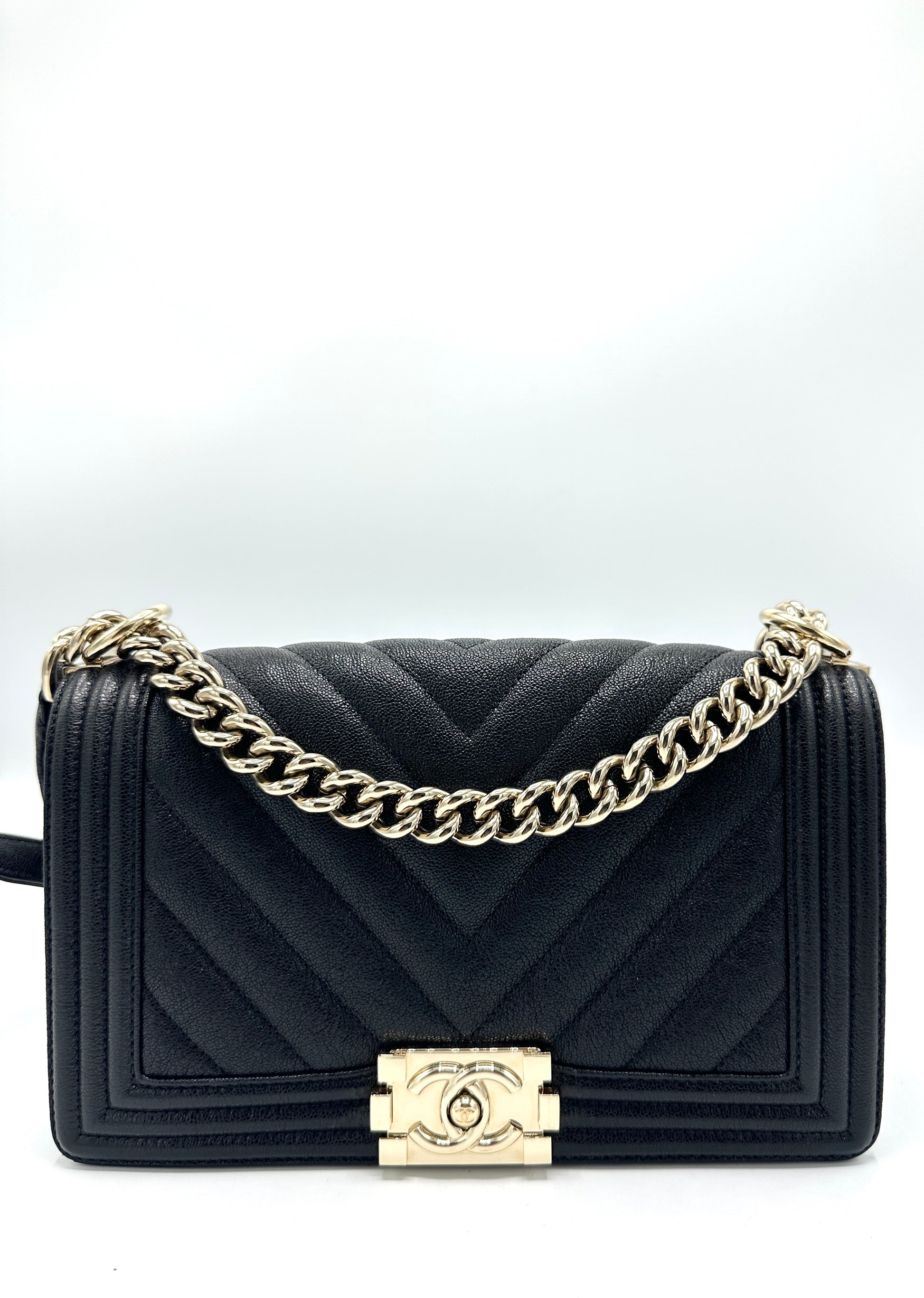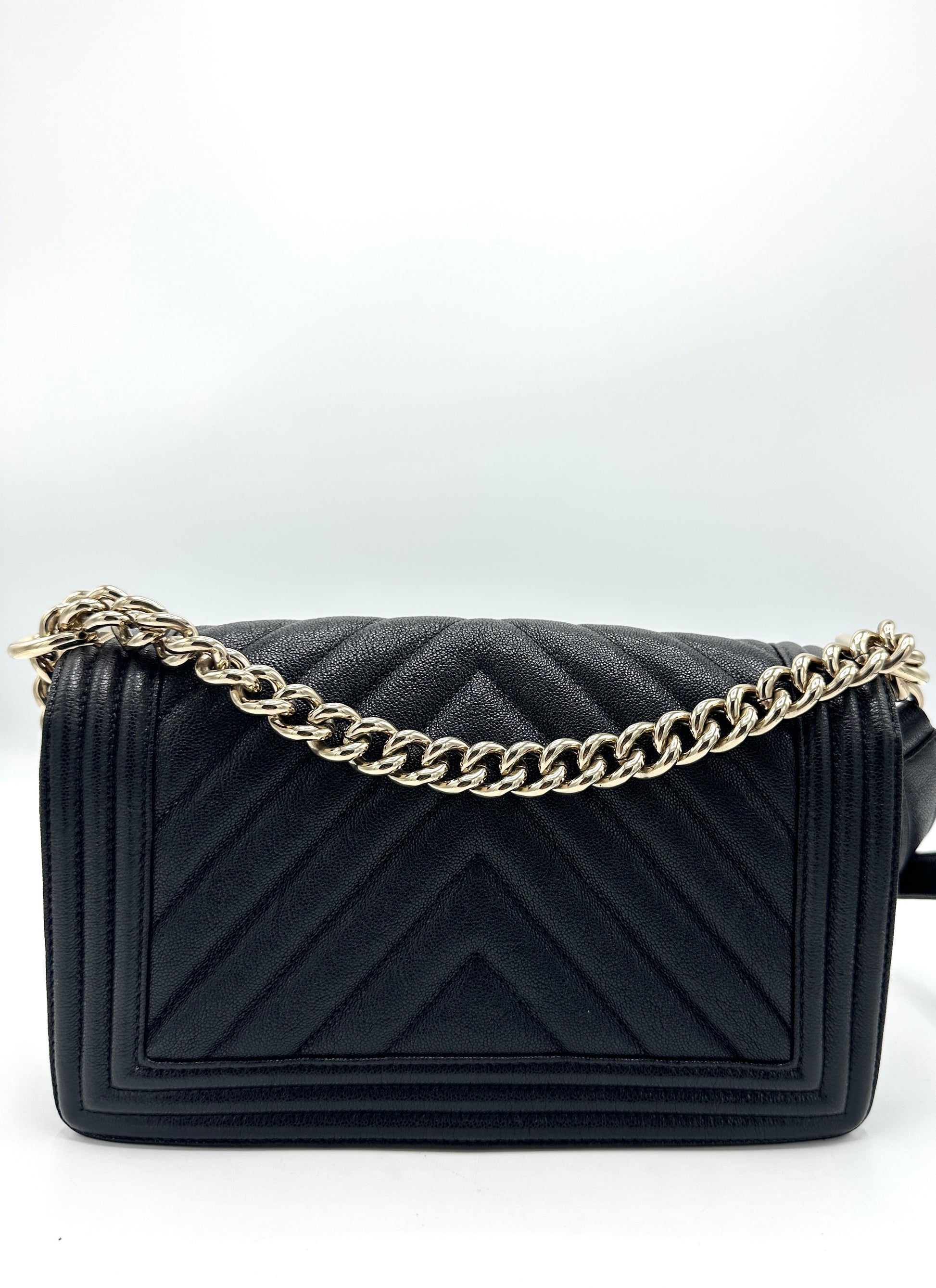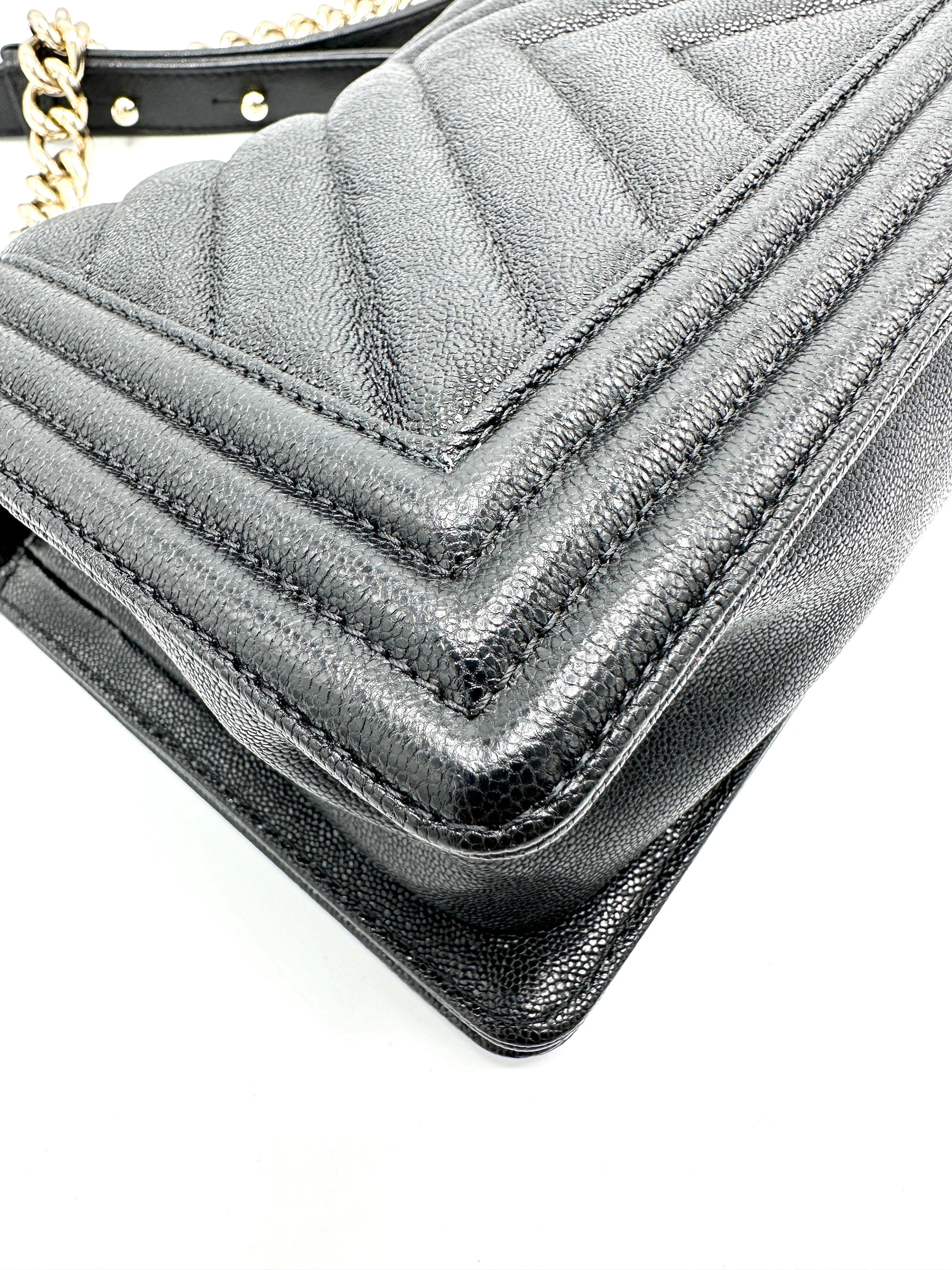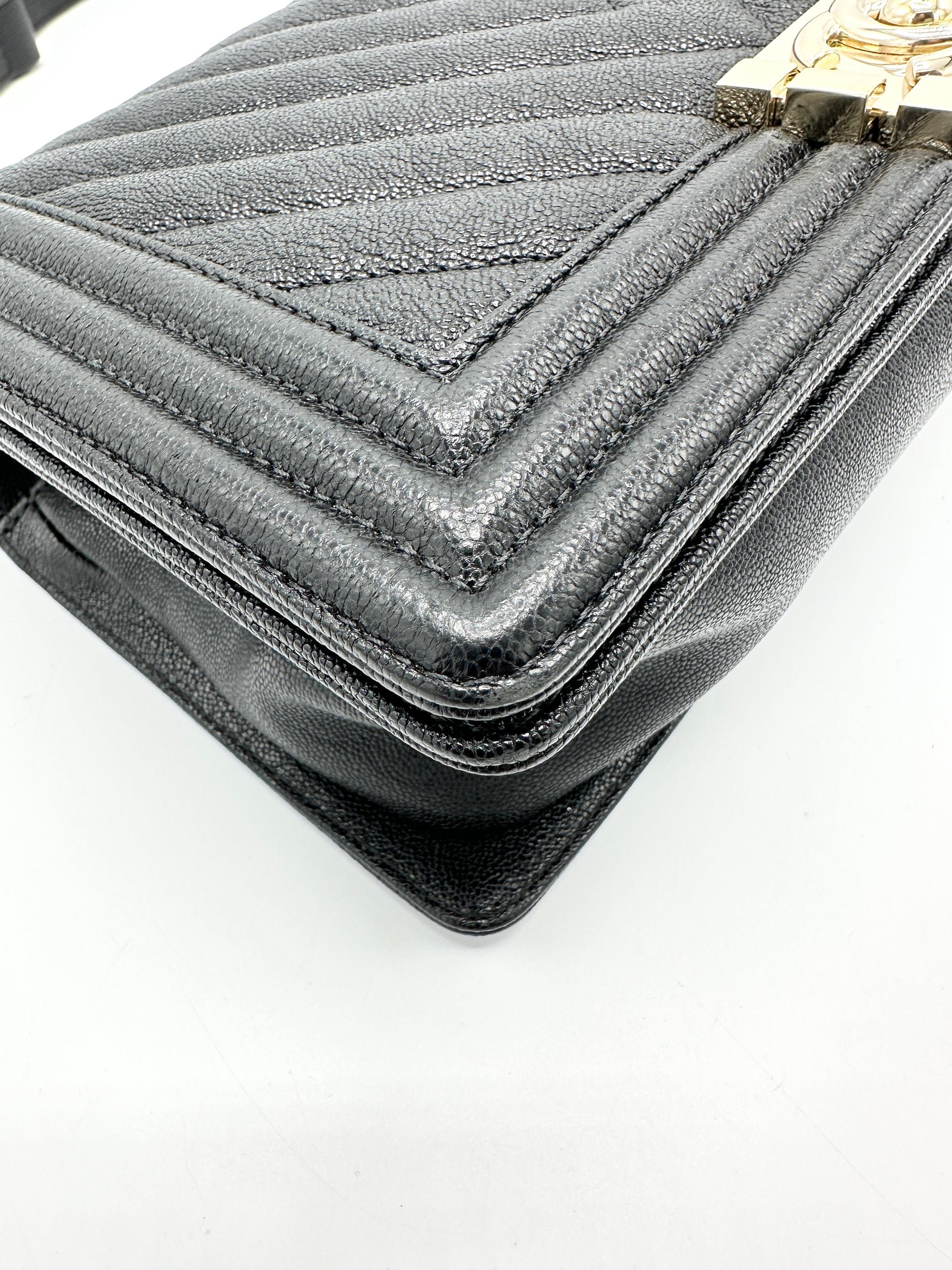 100% Authentic Chanel Black Caviar Chevron GHW Medium Boy Bag