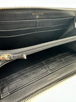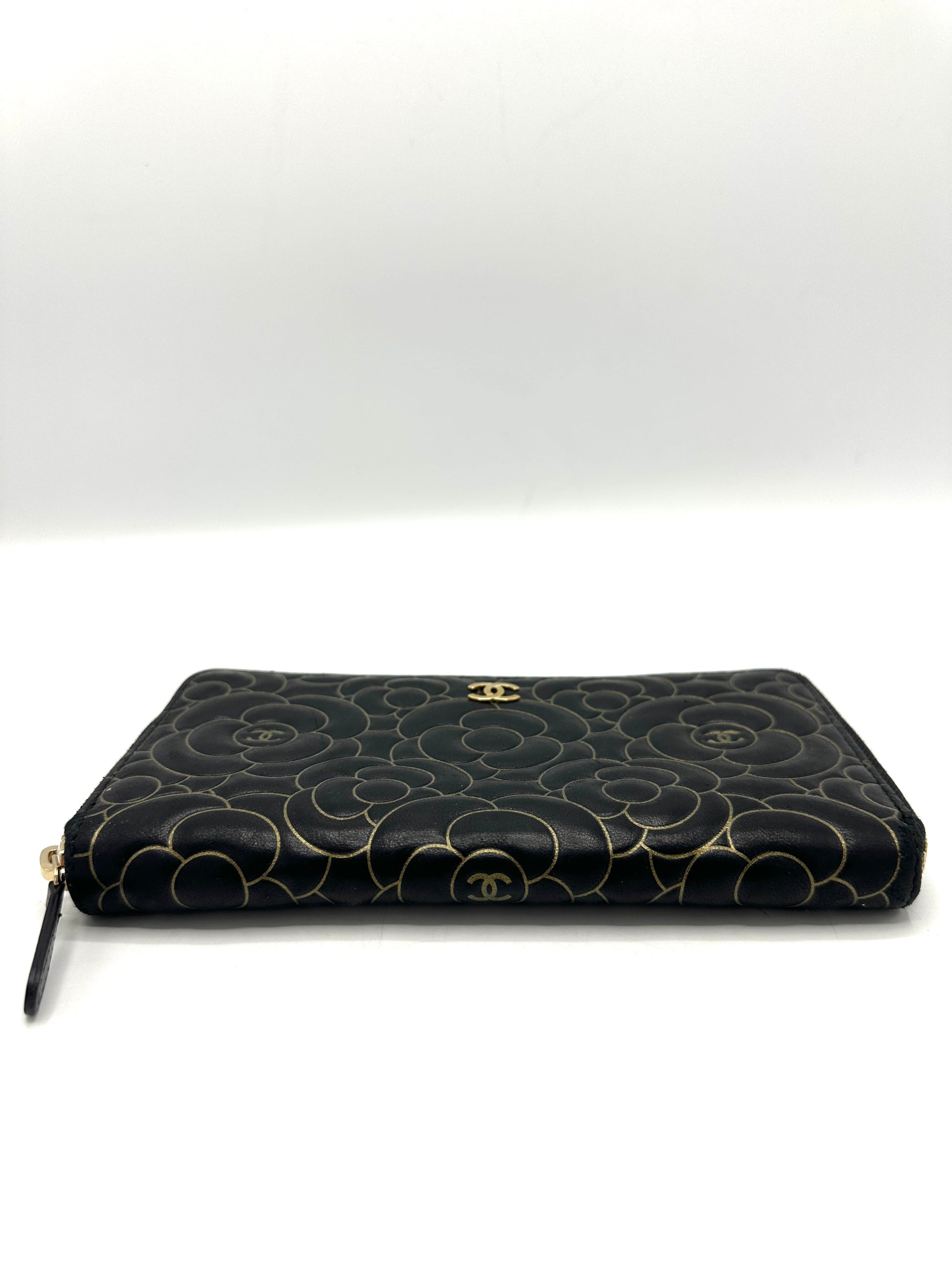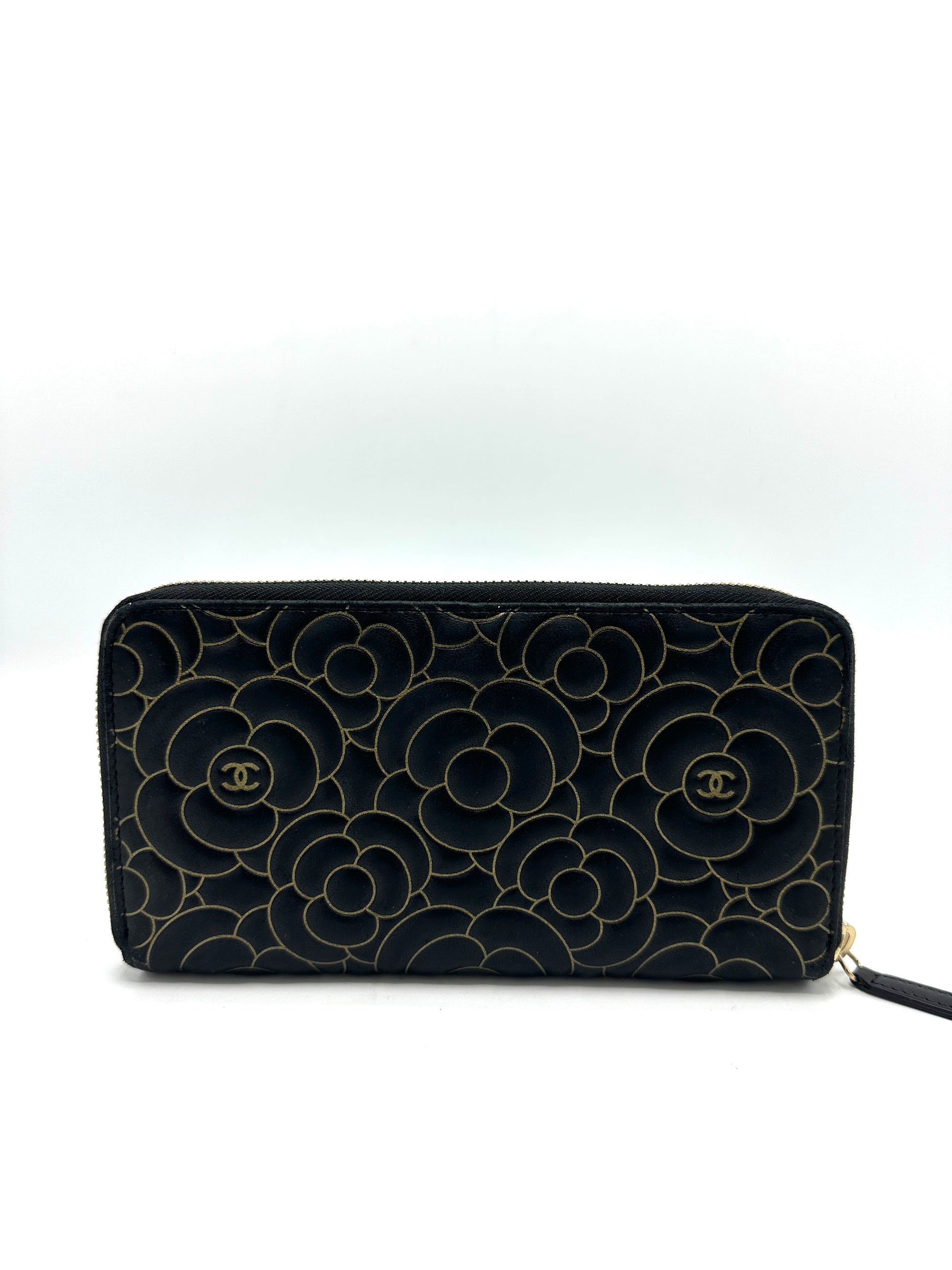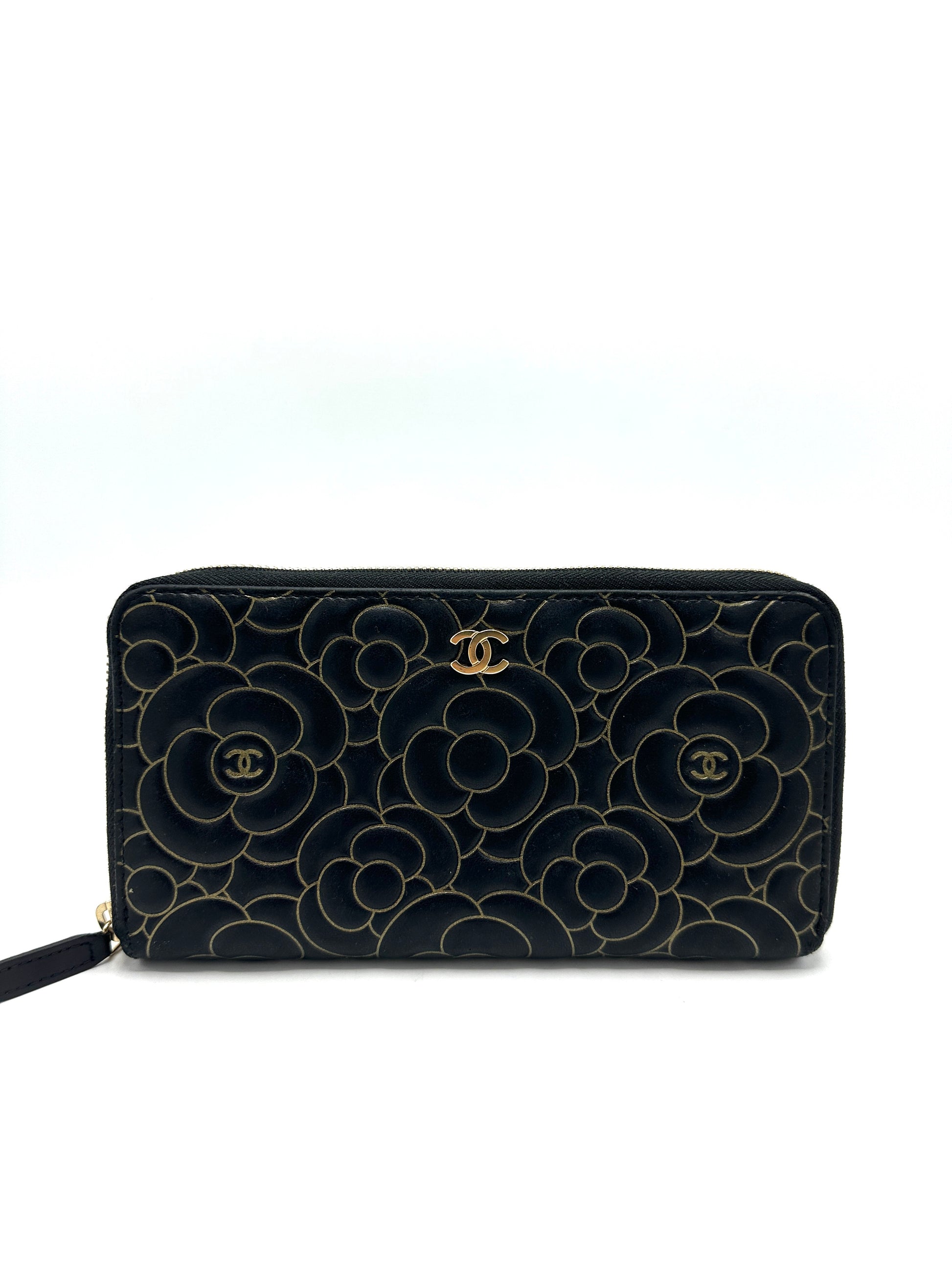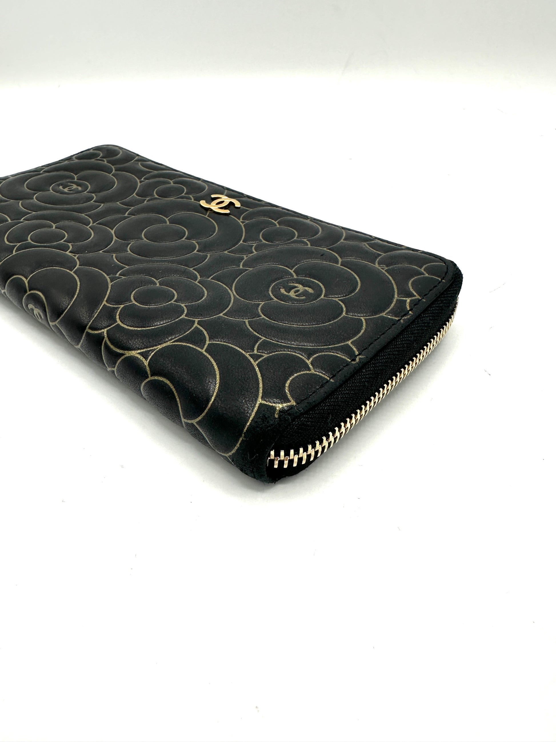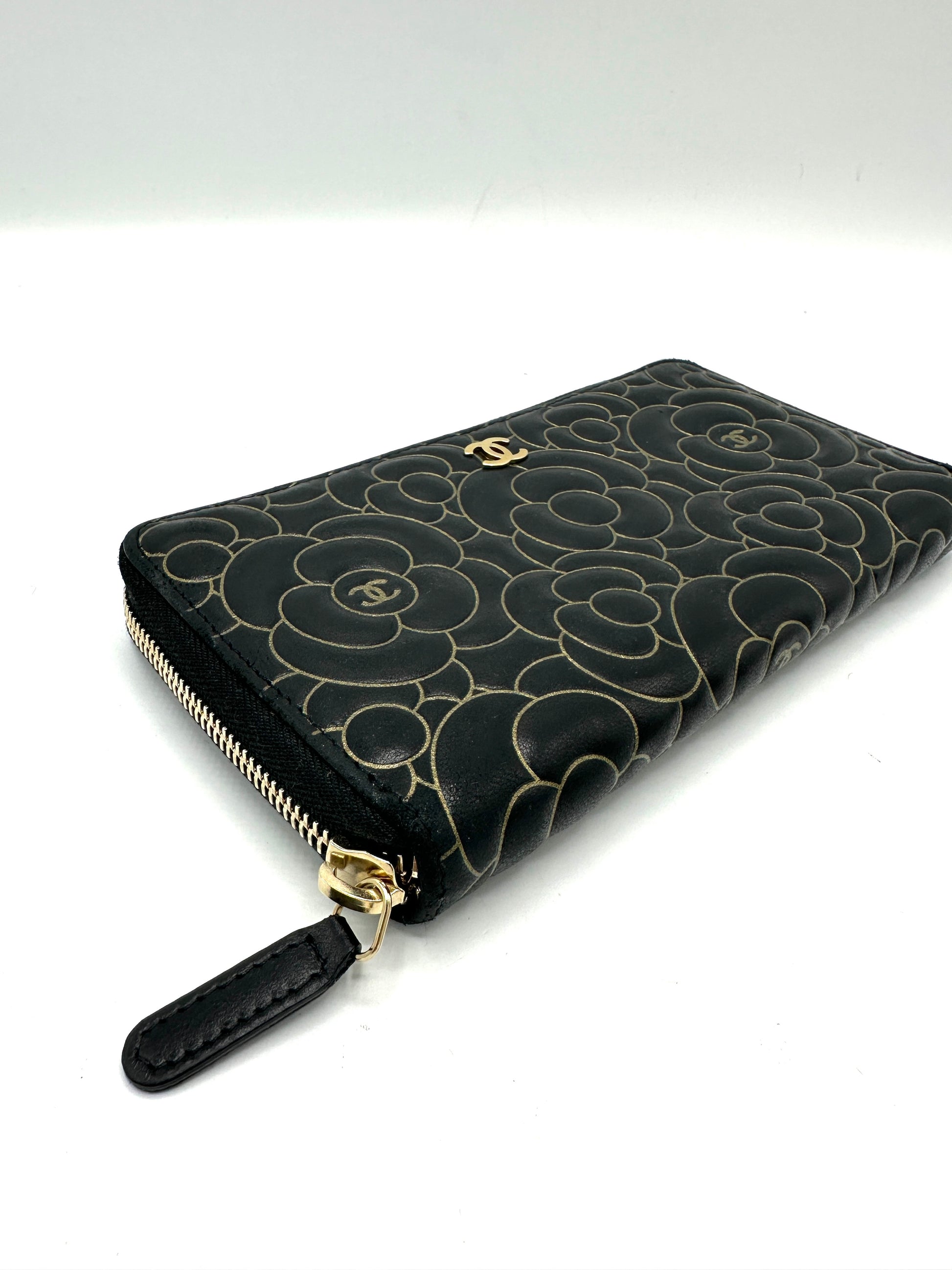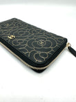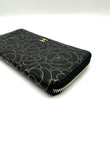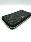 Black Lambskin Gold Border Camelia Flower Zippy Wallet