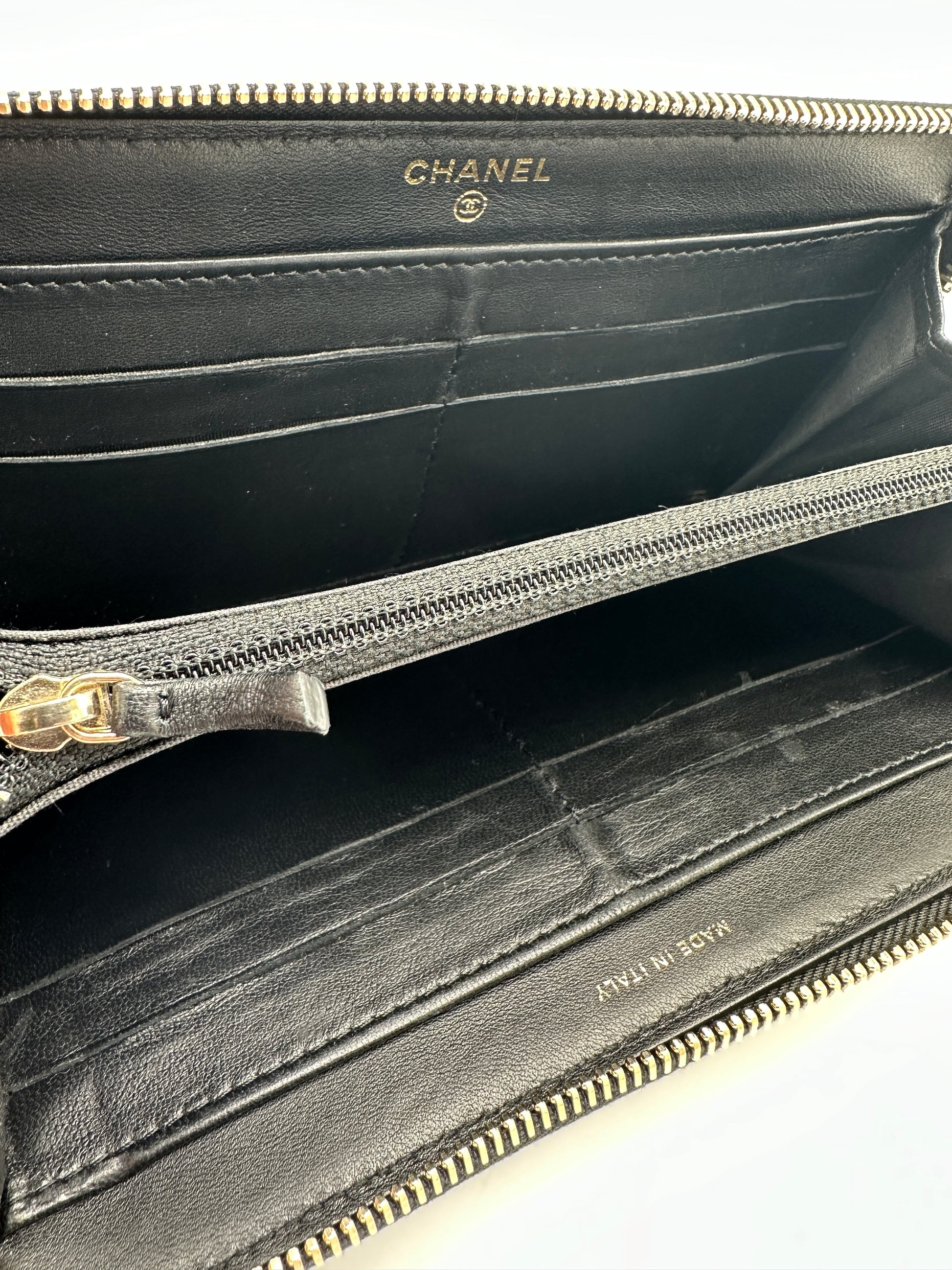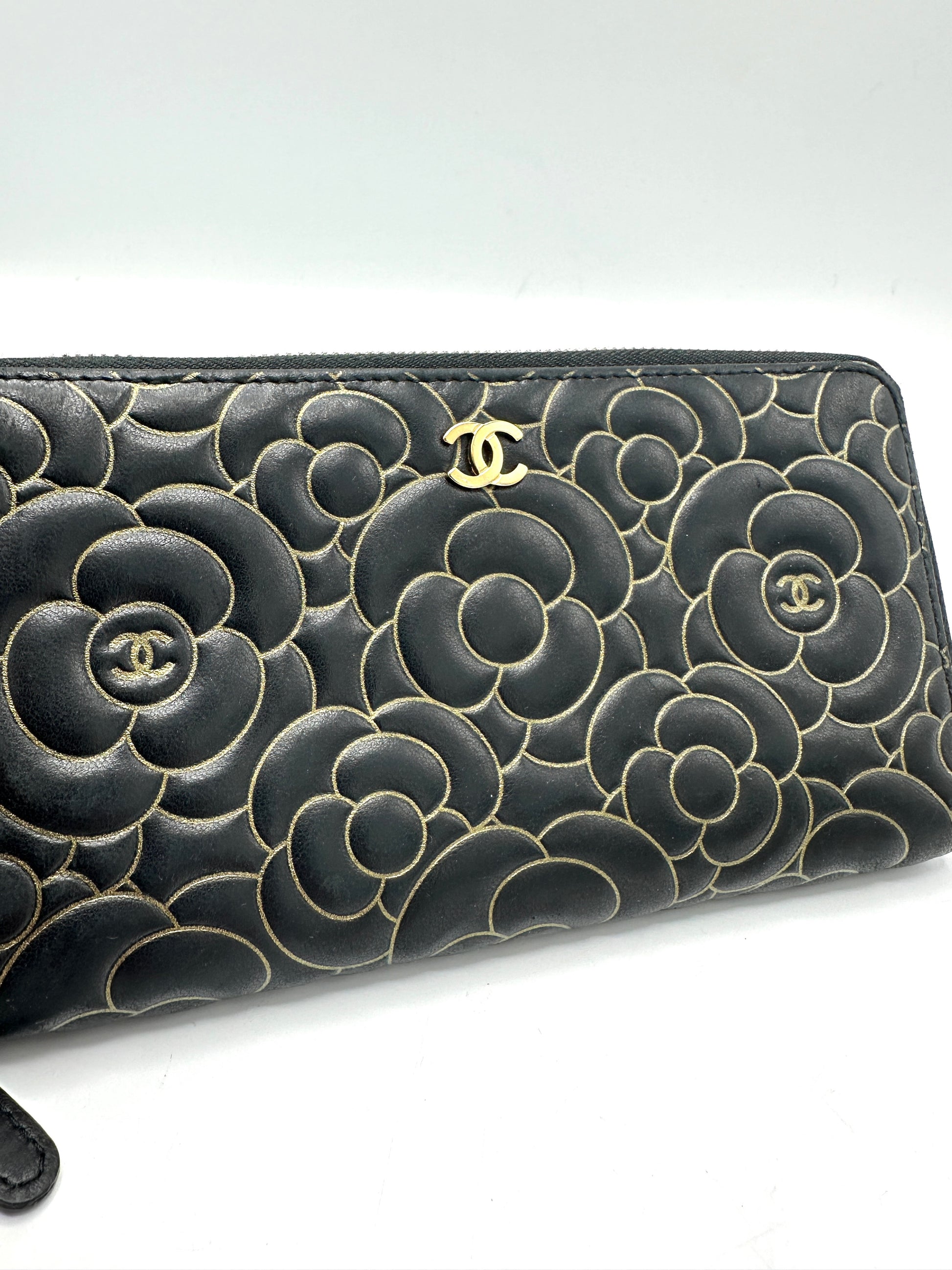 100% Authentic Chanel Black Lambskin Gold Border Camelia Flower Zippy Wallet