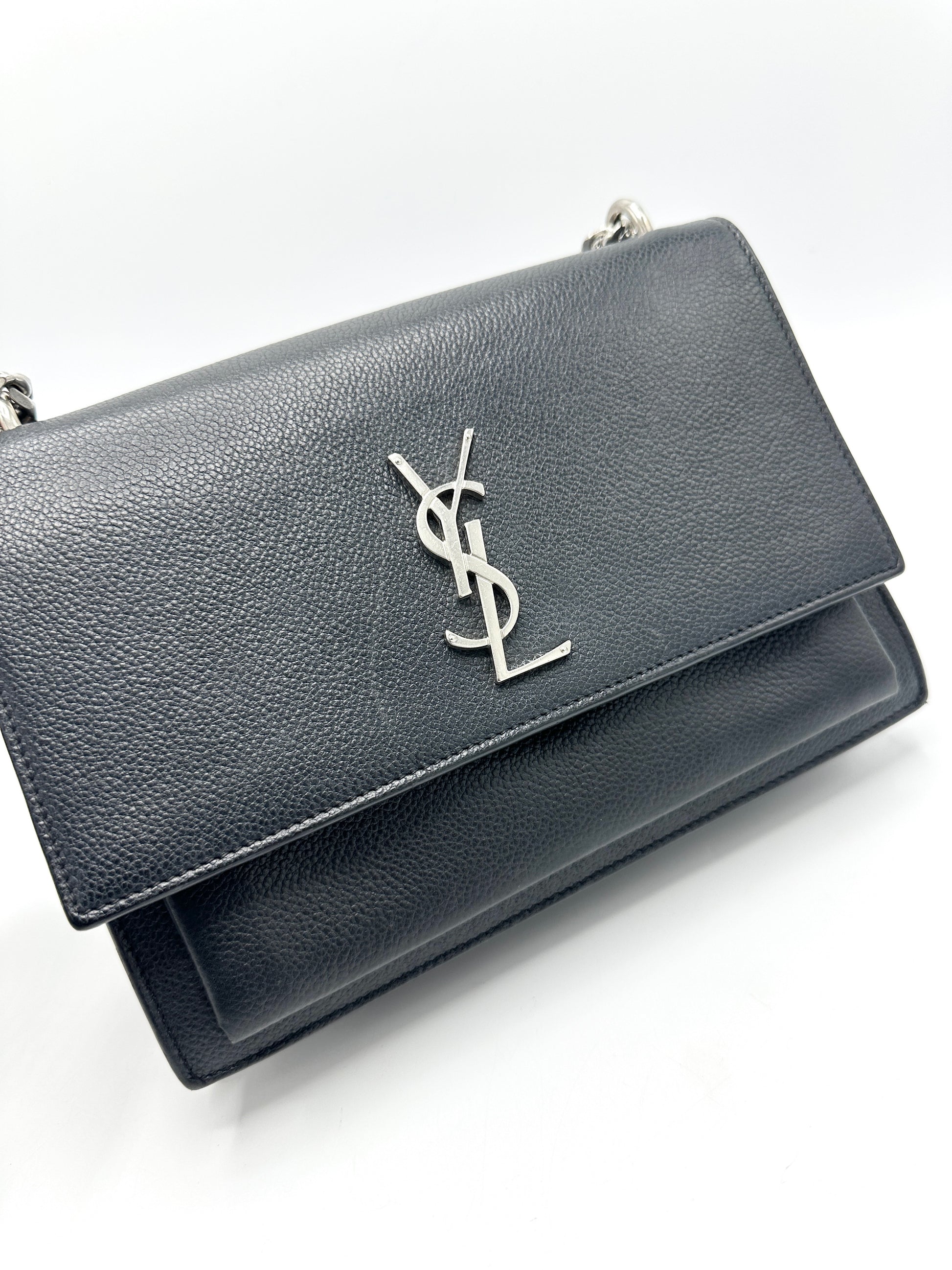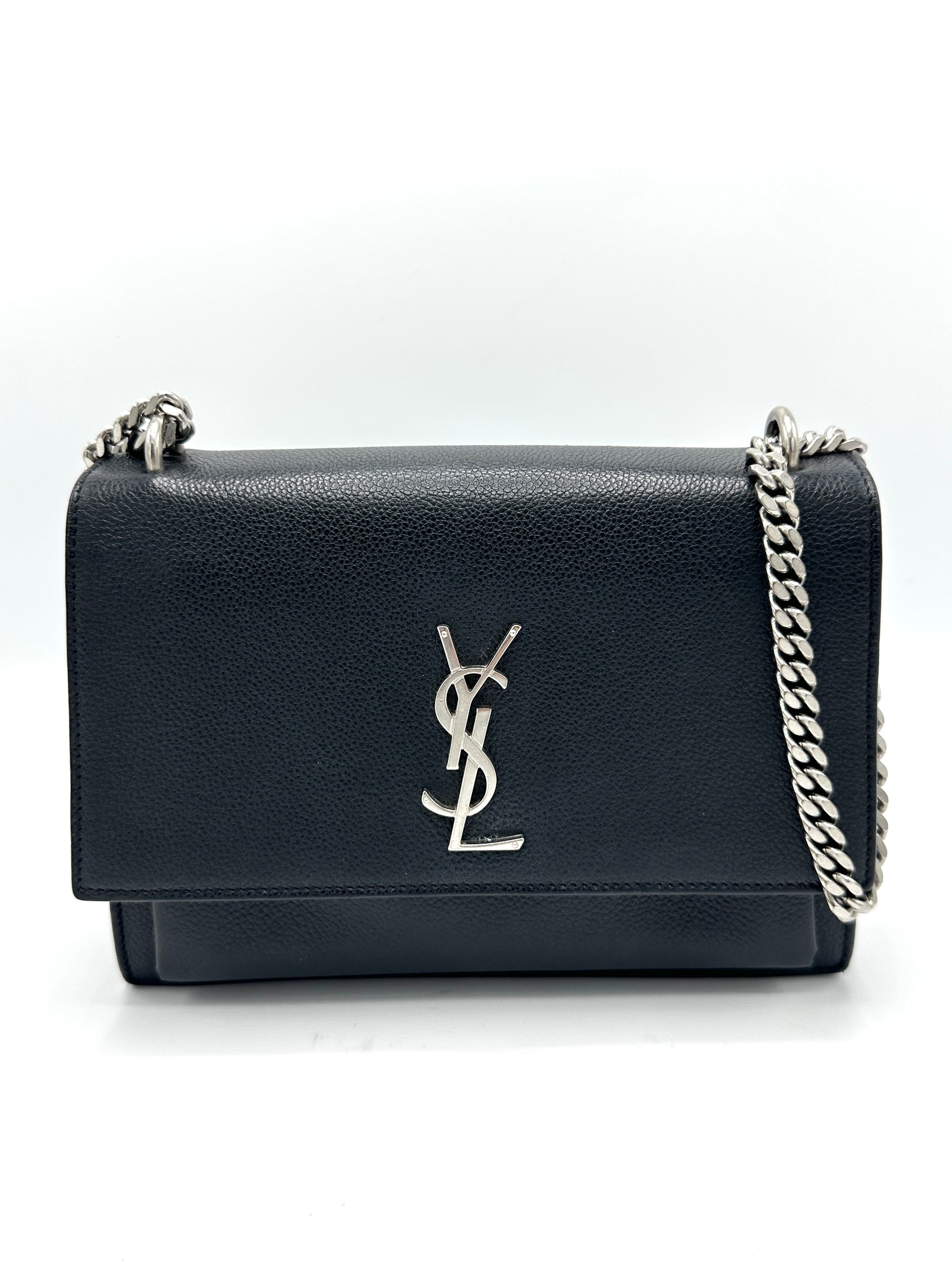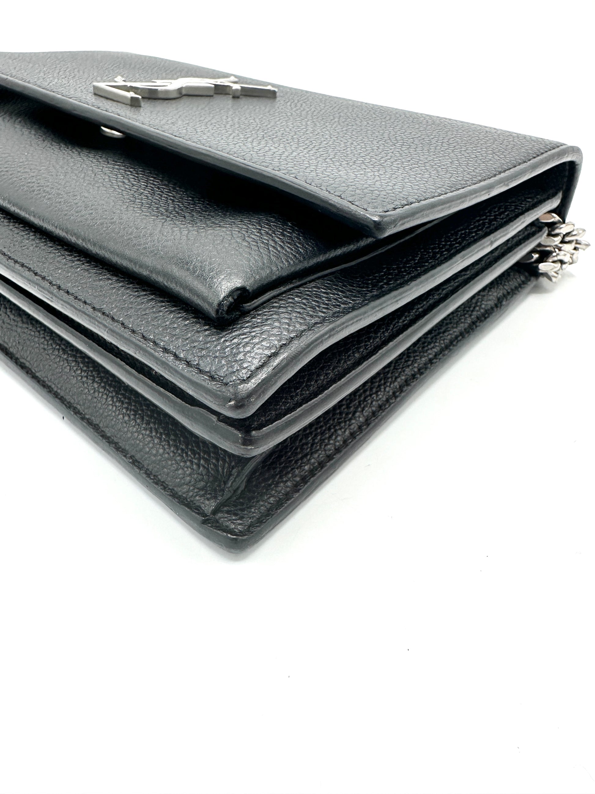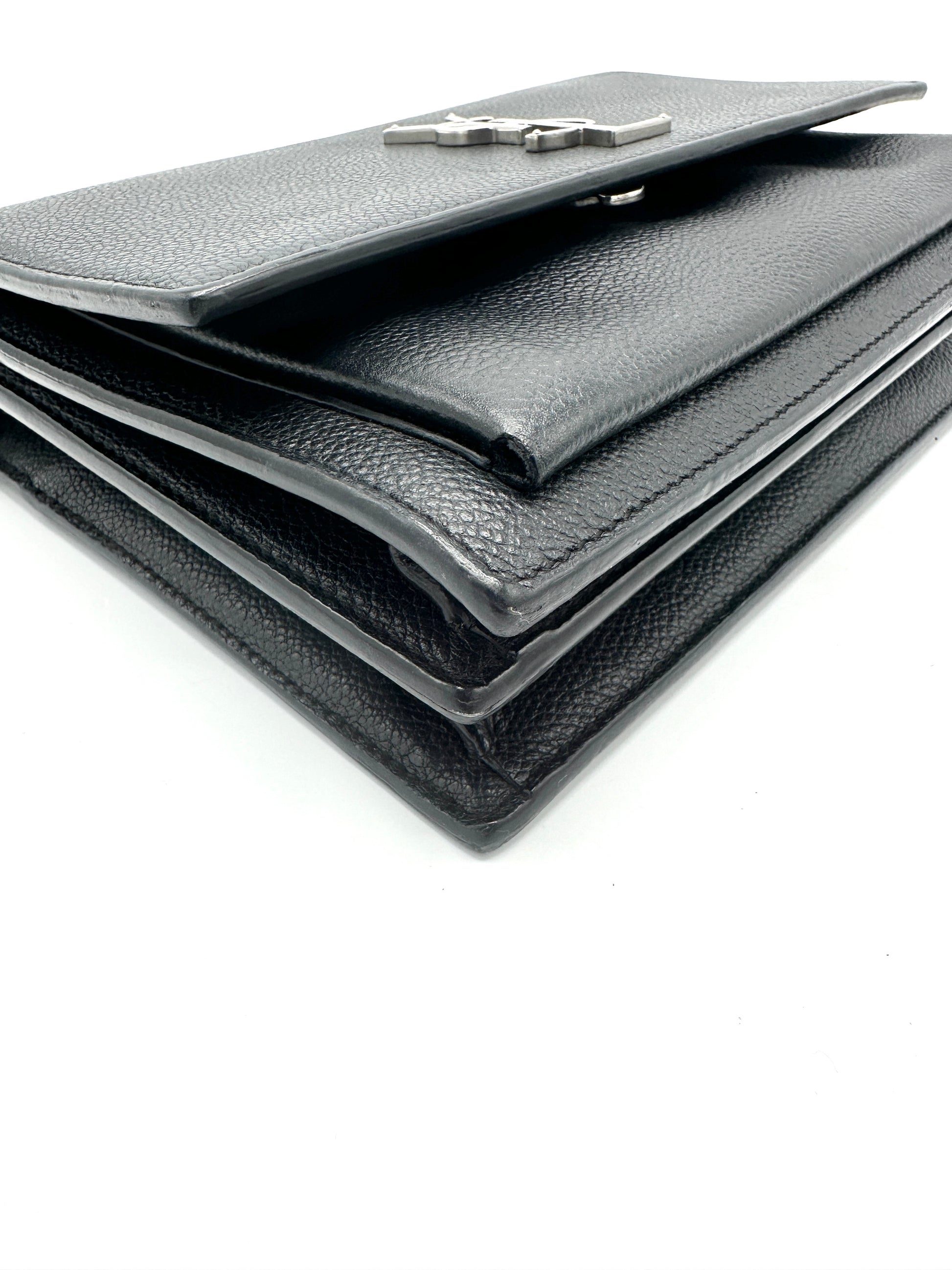 100% Authentic Saint Laurent Black Pebbled Leather SHW Sunset Chain Flap